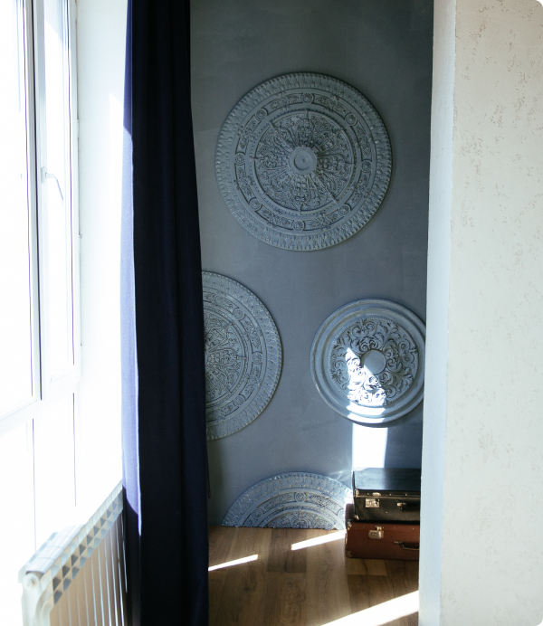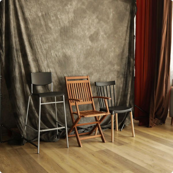 Разнообразные флаги, цветные бумажные фоны, аутентичные стулья, плотные шторы, современное световое оборудование и... шикарная серая стена, на которой получаются потрясающие портреты.
